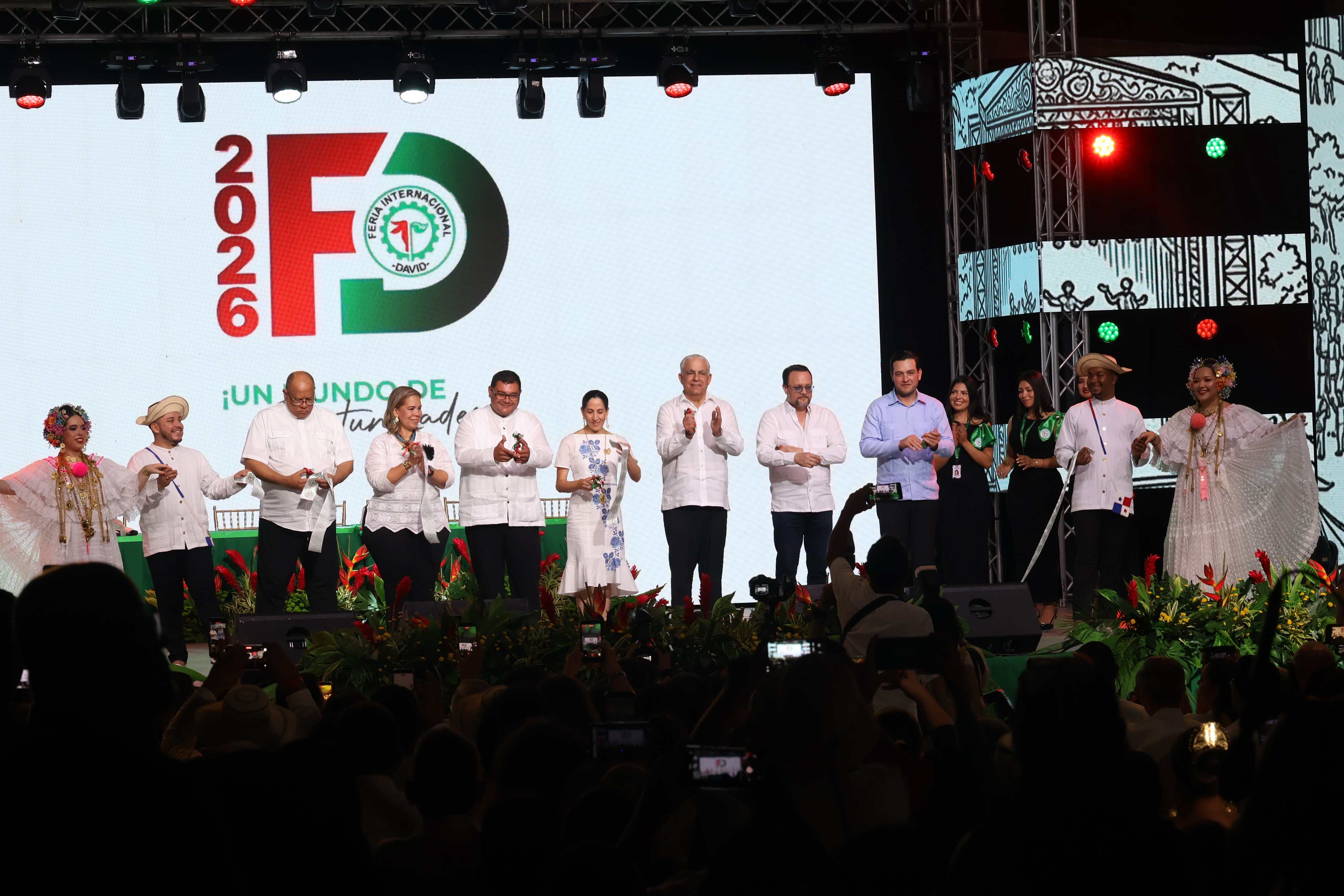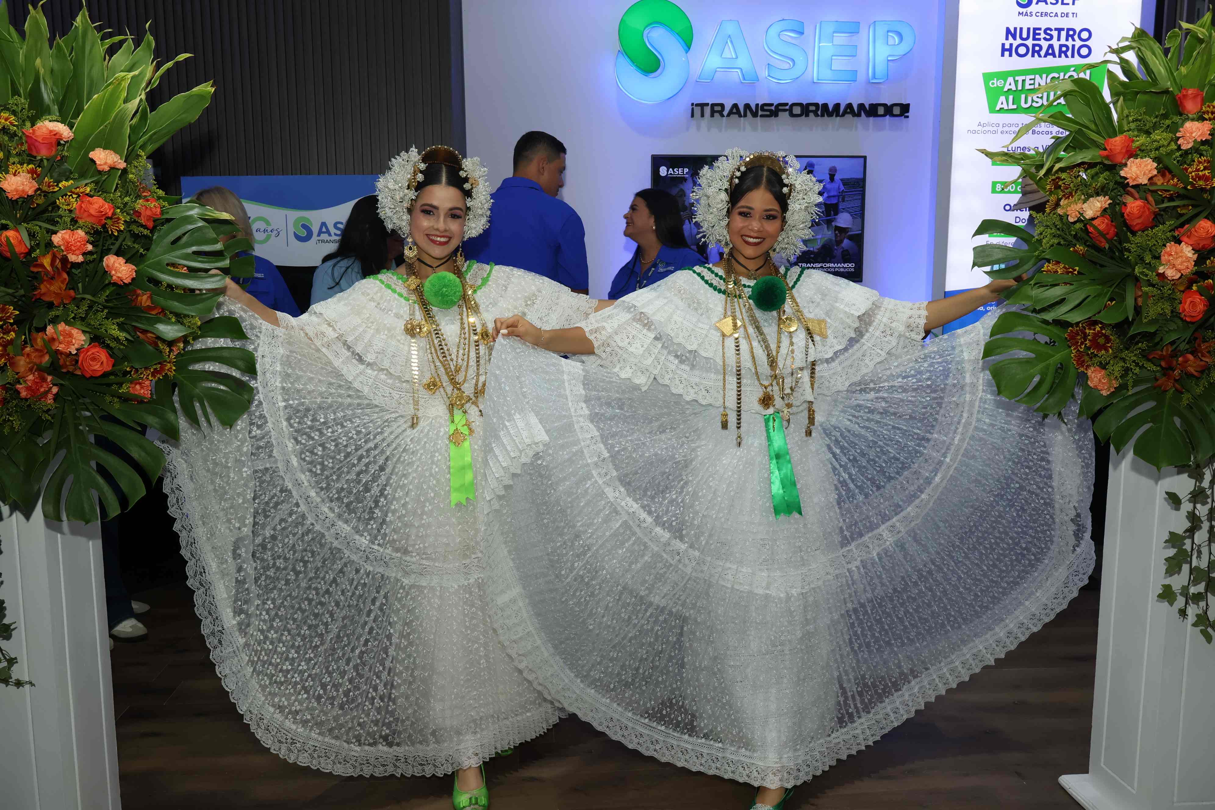 Dos bellas representantes de la mujer chiricana, ataviadas con polleras blancas, sostuvieron el listón ceremonial, al momento directivos de la Autoridad Nacional de los Servicios Públicos (ASEP) realizaran el corte inaugural de su pabellón en los locales 21 y 22 en la Feria Internacional de San José de David, en su versión No. 69.