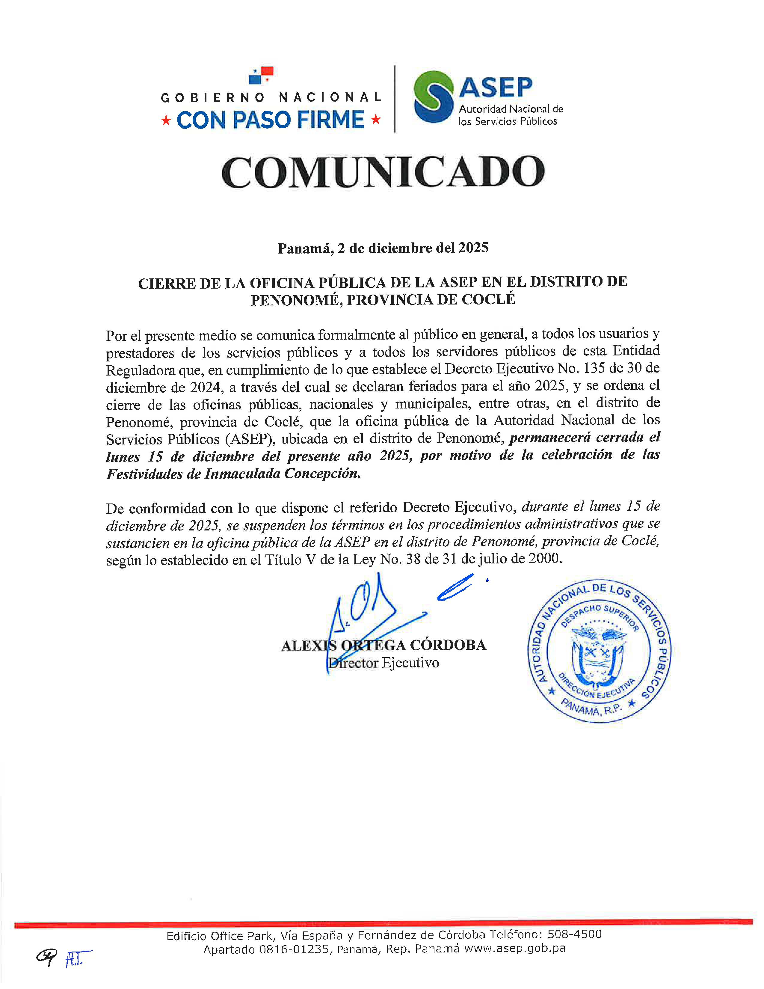La Autoridad Nacional de los Servicios Públicos (ASEP) [...]